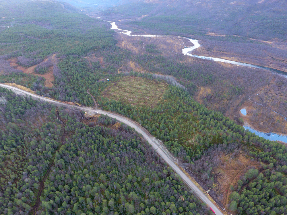 Preparing for E3D Array 1 – Skibotn, Norway. Trees have now been removed. Pipes for the electrical and fibre cables have been deployed, also for most of the planned outriggers